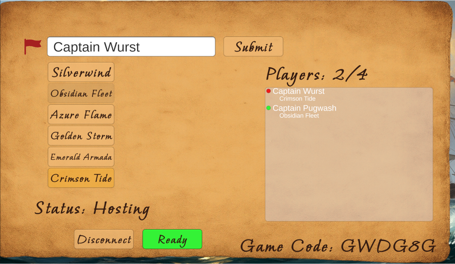 Then in the game lobby you can set your name, set your fleet, and mark when you are ready.
